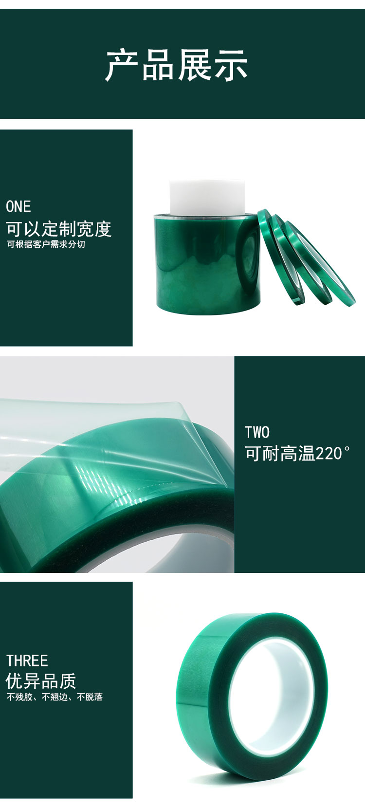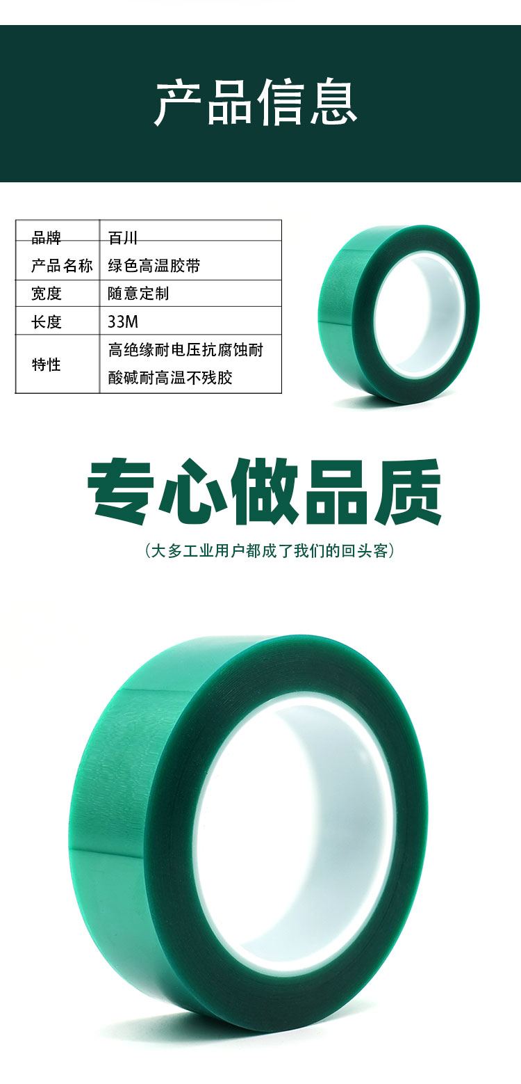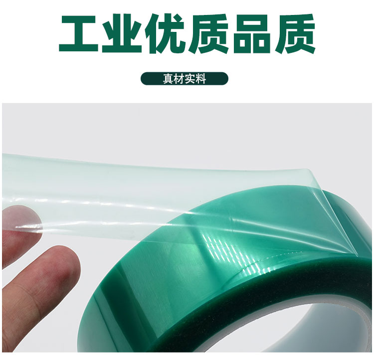 該膠帶膠紙以柔軟PET聚酯薄膜為基材,單面涂布高性能有機硅壓敏膠而成。主要用做高溫環境工作表面處理遮蔽保護,電鍍,電泳、超高溫烤漆、粉末噴涂及晶片元件端電極使用等
